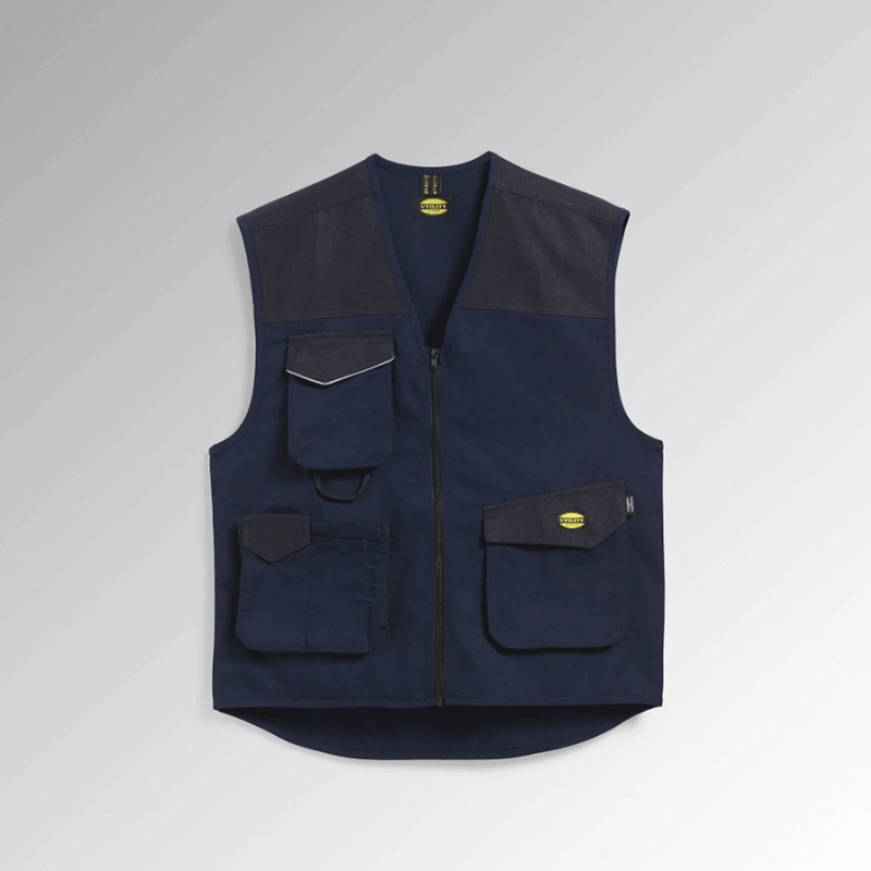 Colete multibolsos com detalhes refletores e detalhes contrastantes em tecido resistente à abrasão. Costura dupla.