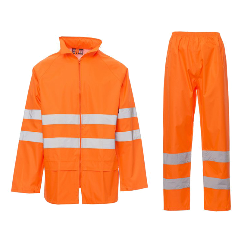 Fato de chuva HI-VI RAINSET CHEMITOOL é de alta visibilidade com fitas refletoras e impermeável. Casaco com fecho de correr, capuz desdobrável, mangas direitas, rede nas costas. Calças com cintura elástica e dois bolsos. Frente simples com fecho.