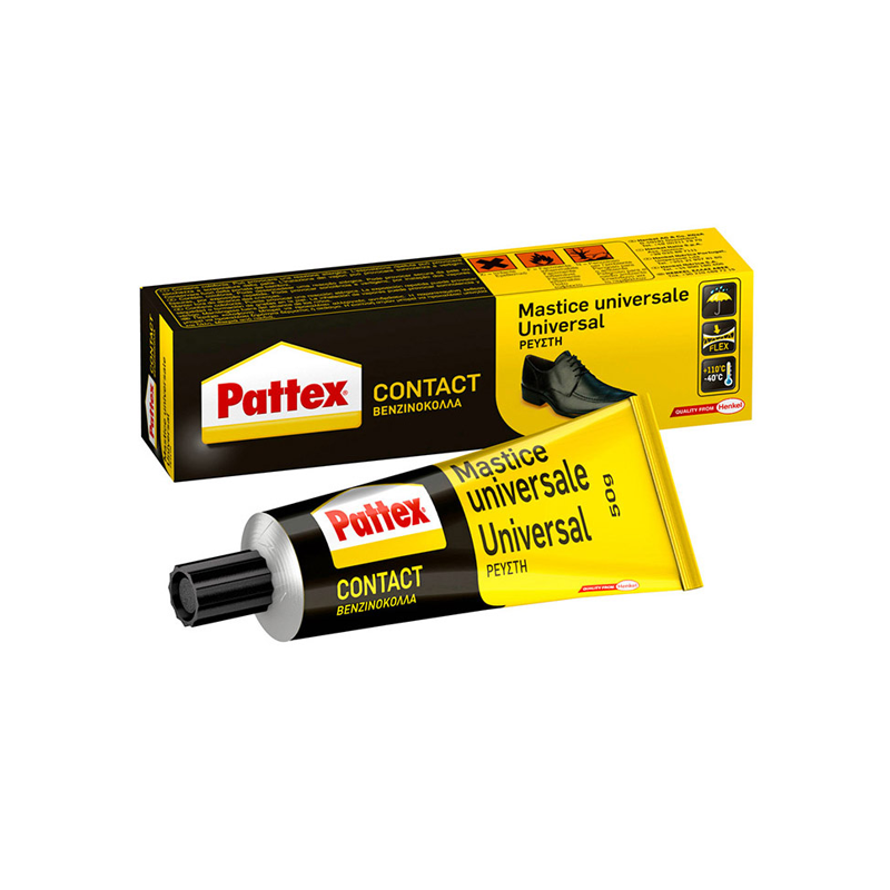 Pattex Cola de Contacto, para utilização universal, é a mãe da marca Pattex. Cola rapidamente com alto poder de aderência. Fácil deaplicar e espalhar, esta cola é ideal para colar superfícies mistas – e para fazer o verniz aderir a cantos complicados. Geralmenteutlizado em interiores num vasto número de materiais, excepto PE e PP. Adequado também para laminados. Resistente ao calor.