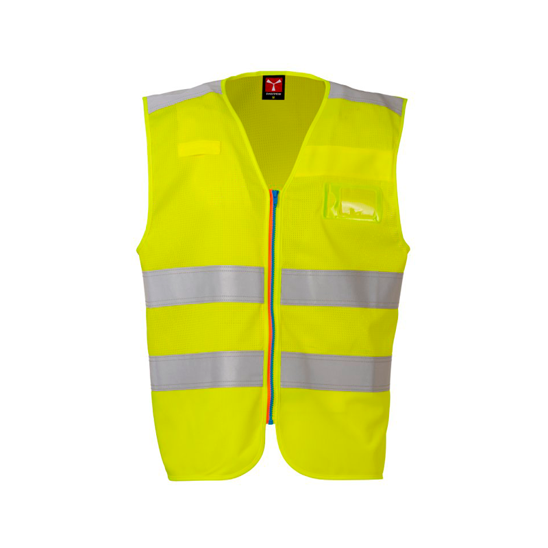 Colete de alta visibilidade em malha respirável na parte superior e tecido dry-tech na parte inferior, com bandas refletoras nos ombros e no corpo.
