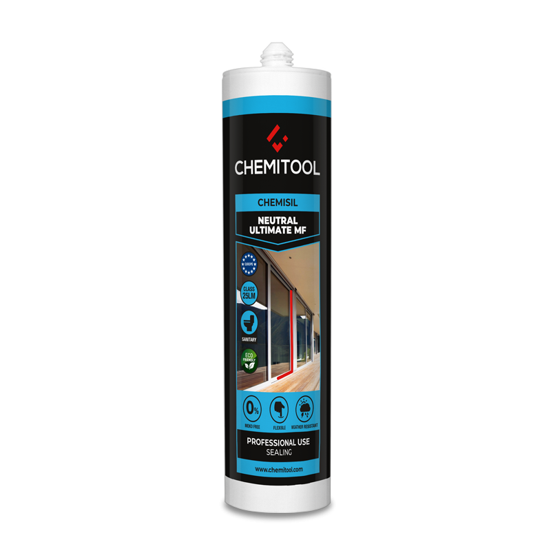 Silicone Neutro Ultimate MFCHEMISIL é um selante monocomponente de base neutra, que cura em contacto com a humidade atmosférica e não tem MEKO (produto prejudicial ao meio ambiente e à saúde). Selante com efeito elasticidade permanente e excelente aderência na maioria dos materiais de construção.APLICAÇÕES: O produto é recomendado para a vedação de juntas em ambientes onde pode haver formação de mofo (casas de banho e cozinhas), pois impede a formação de bolores.Devido à sua excelente aderência, o produto é adequado para vedação e colagem de diversos materiais de construção (concreto, tijolo, madeira, aço, alumínio, diversos tipos de plástico, concreto espumado, cerâmica, gesso cartonado, vidro, metal, porcelana, isopor e esmalte).Também pode ser usado para envidraçamento, instalação de vidro em esquadrias de madeira, alumínio e PVC, para montagem de clarabóias, vedação de juntas de dilatação em fachadas e pavimentos, para juntas finais entre caixilharias, soleiras e paredes, caixilhos de persianas, entre